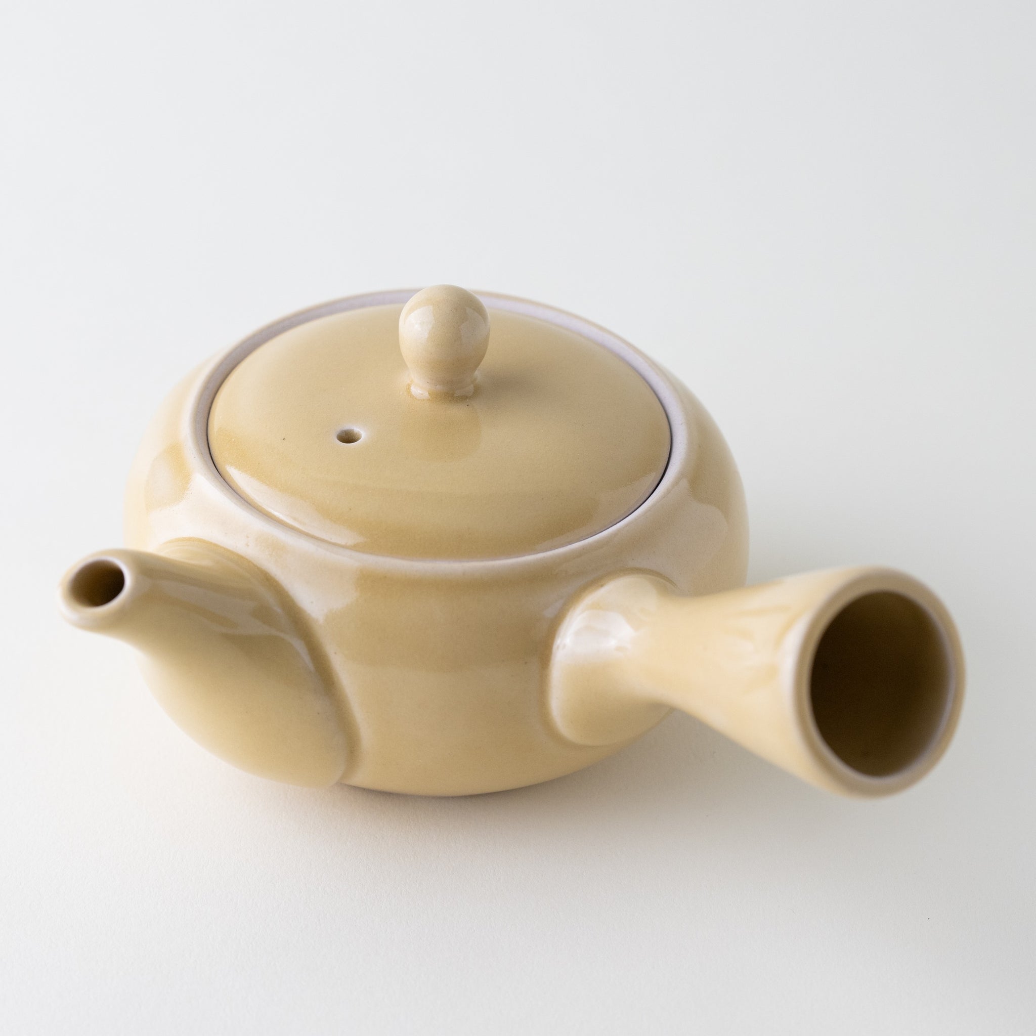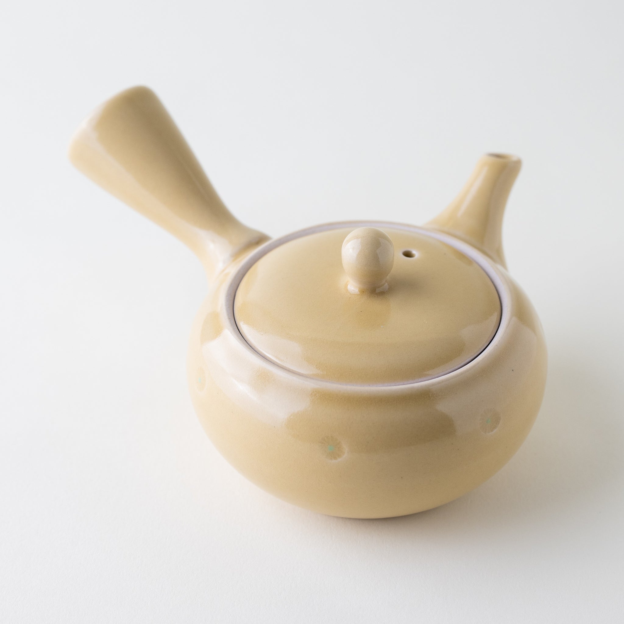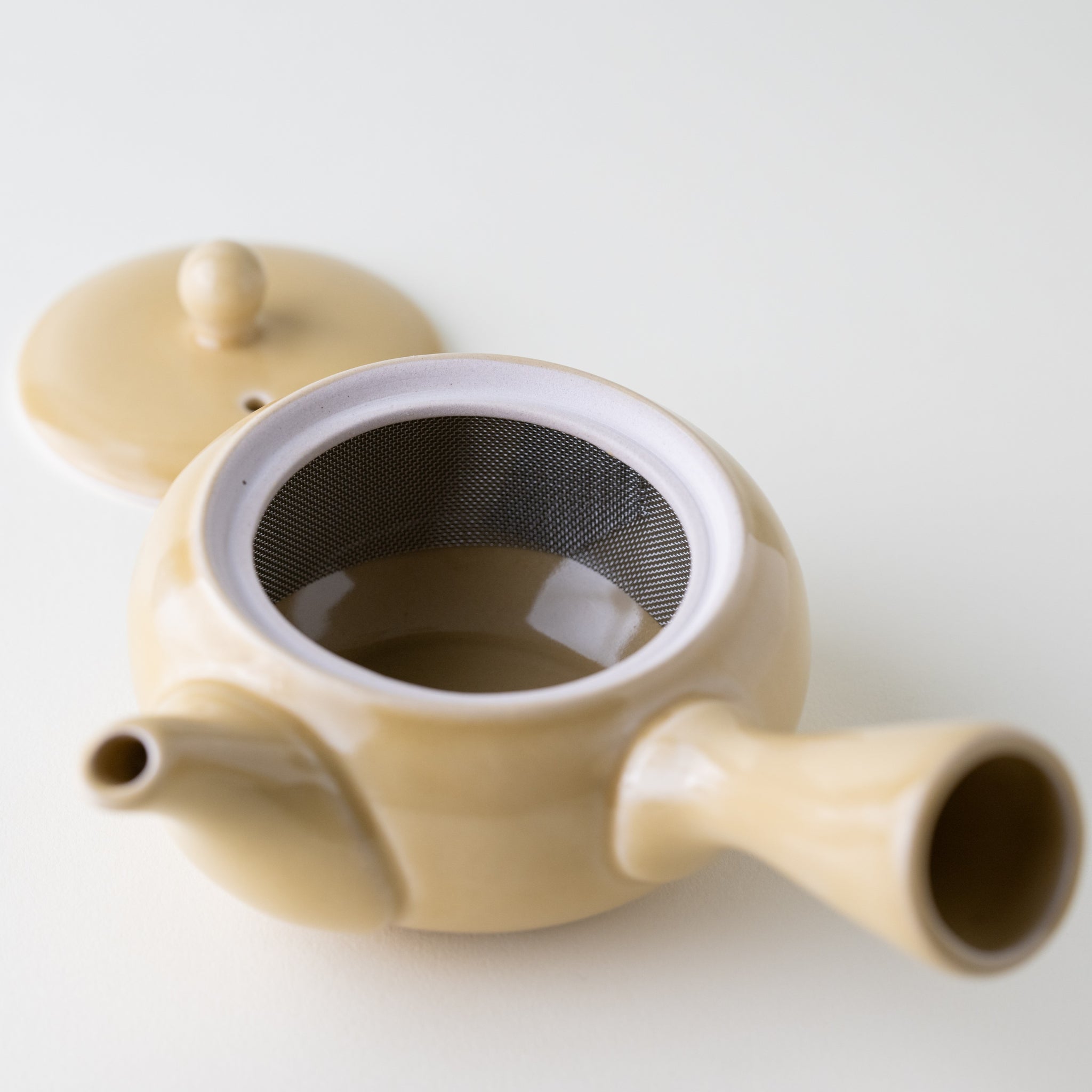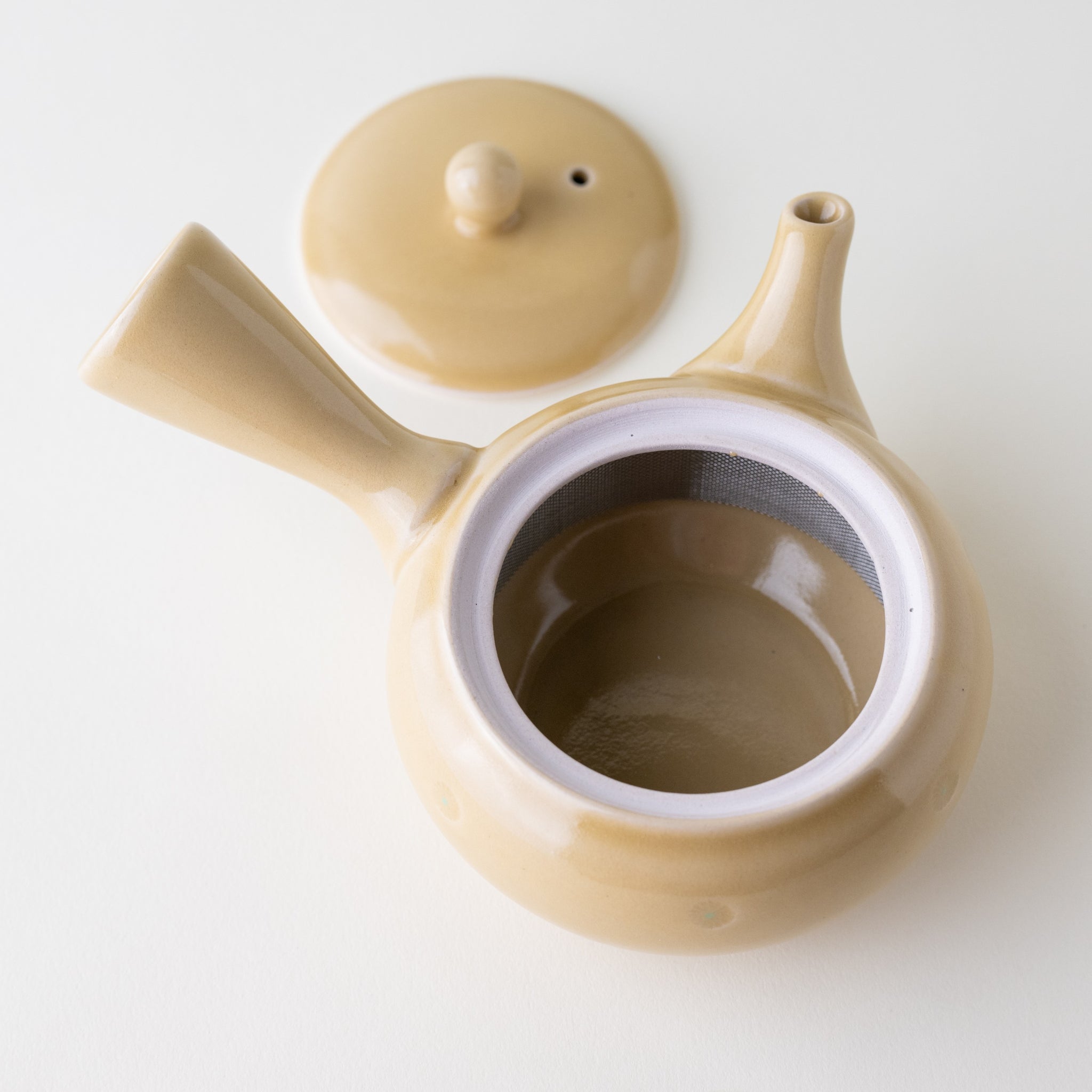 A kyusu on the larger side, perfect brewing a mug of tea or sharing tea with two to three people. This kyusu is named Ame-iro, referring to the color of that onions have when they are cooked to a golden brown. The metal mesh of this kyusu is known as obi-ami which wraps around the inside of the pot, like the slightly smaller Midori Kyusu. This makes it great for brewing fukamushicha and other course teas that can clog some kyusu with too small of a filter.