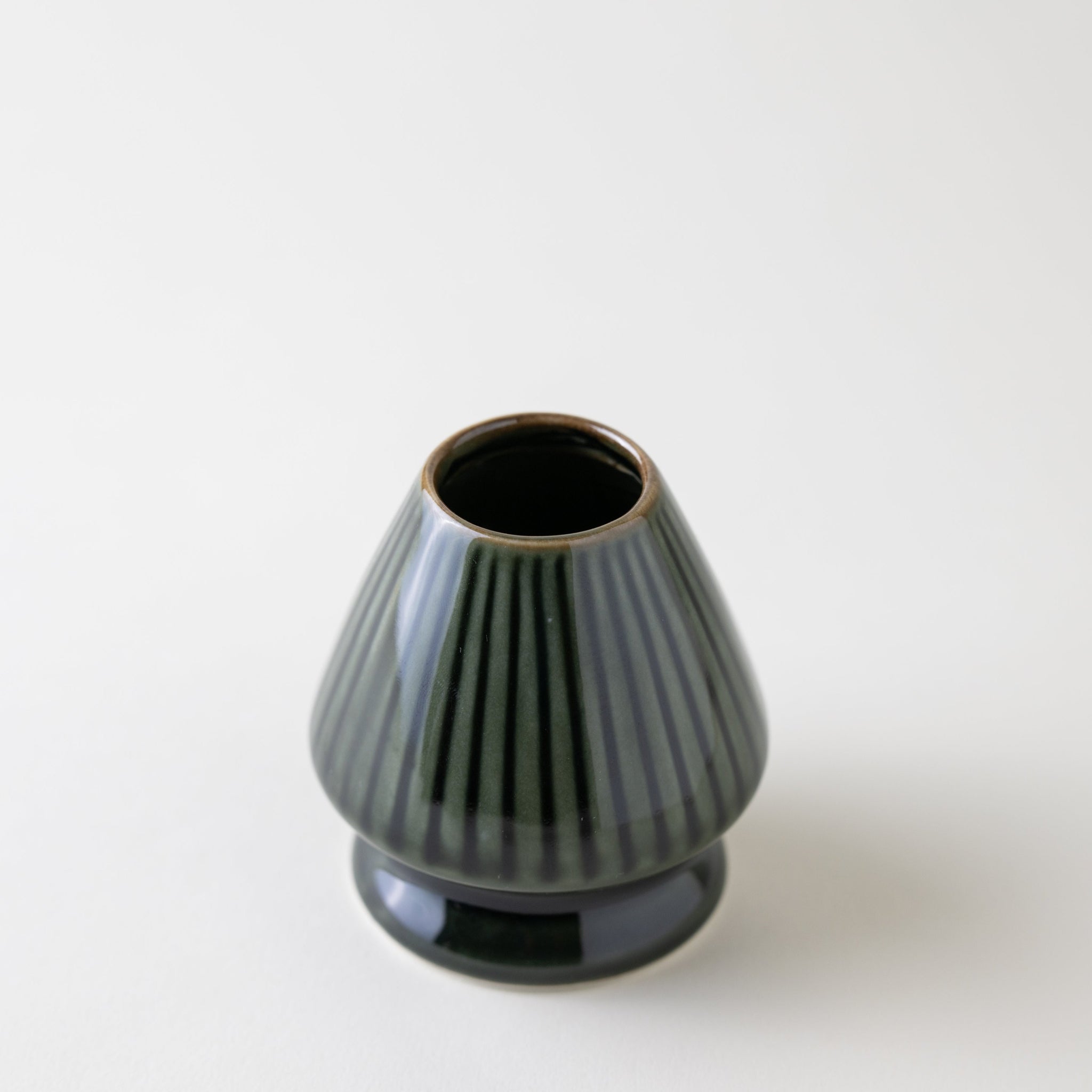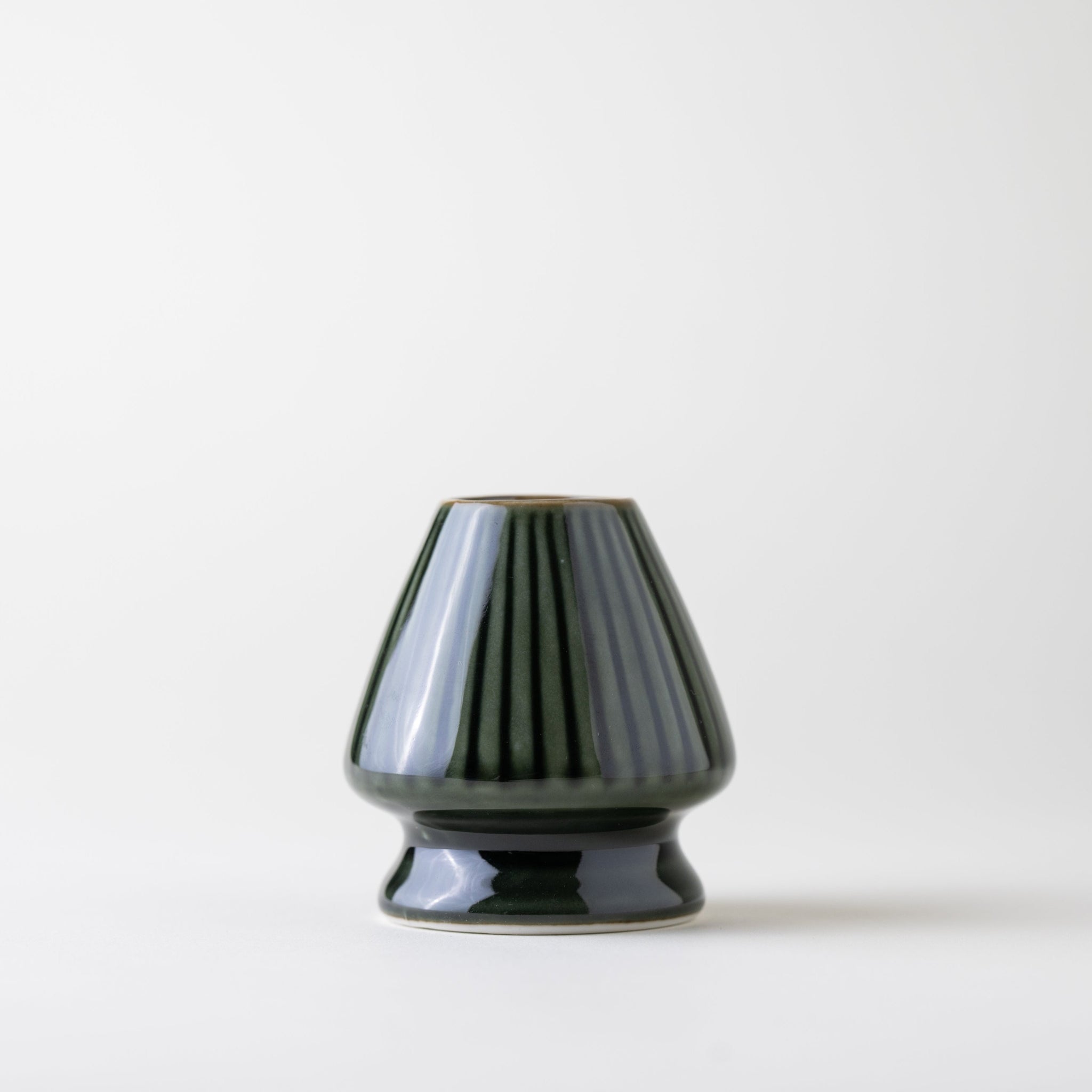 A forest green chasen stand. Crafted in such a way to be slightly ribbed for an added aesthetic. The chasen stand ornaments well your tea space and allows you to rest your chasen in style. Resting your chasen with the chasen stand also helps to preserve the shape of the chasen.