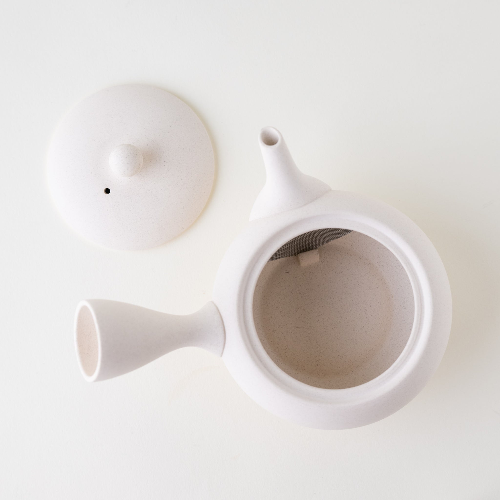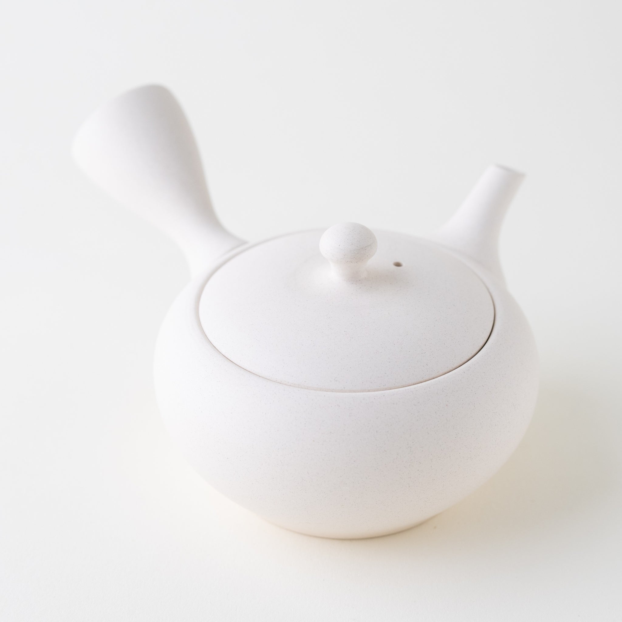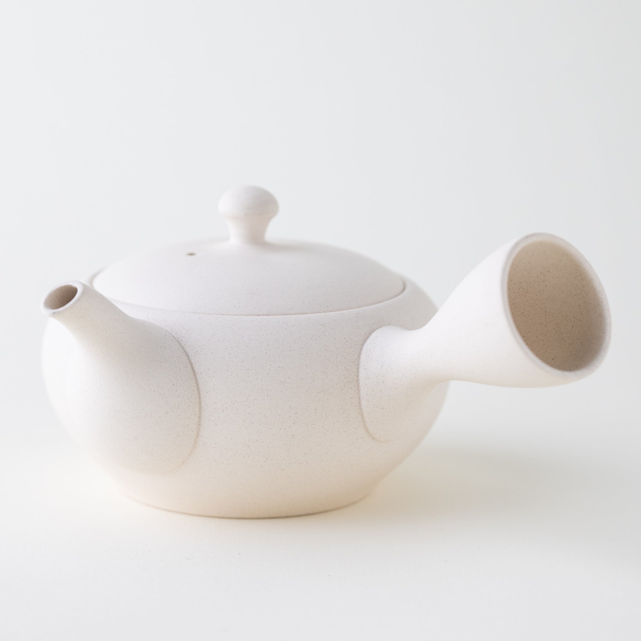 A classic white kyusu. With its metal mesh, this kyusu is great for brewing all types of tea, including fukamushicha. This is because the metal mesh is wide enough to prevent clogging. White tea wares in general are great for brewing tea, as they allow you to appreciate the color of the brew. If you are looking for a standard kyusu for solo brewing or for sharing tea with a friend, this is a great option.