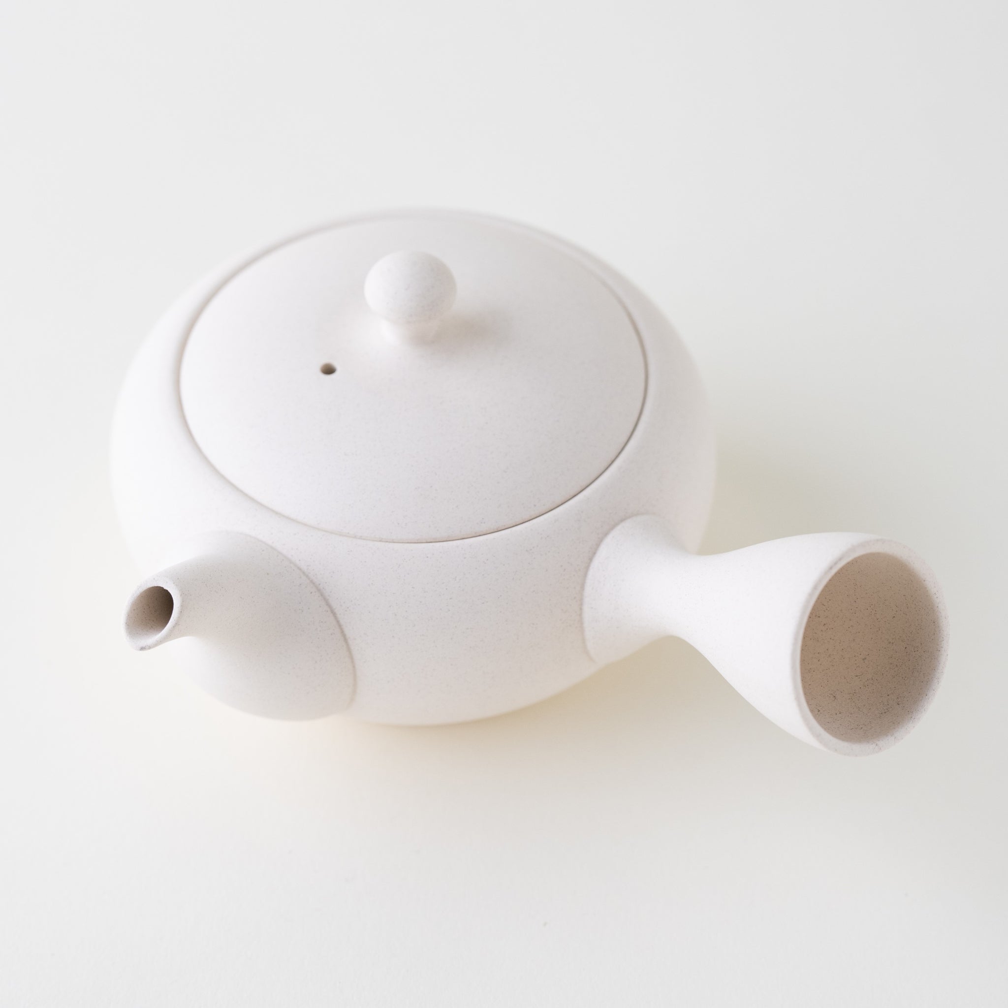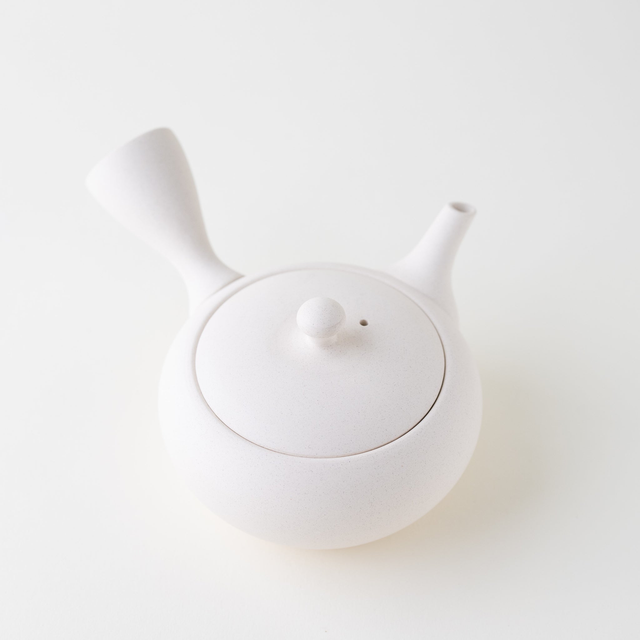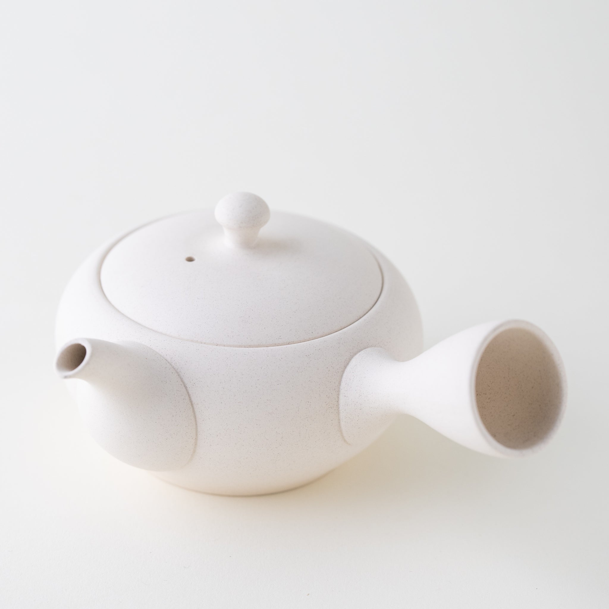 A classic white kyusu. With its metal mesh, this kyusu is great for brewing all types of tea, including fukamushicha. This is because the metal mesh is wide enough to prevent clogging. White tea wares in general are great for brewing tea, as they allow you to appreciate the color of the brew. If you are looking for a standard kyusu for solo brewing or for sharing tea with a friend, this is a great option.