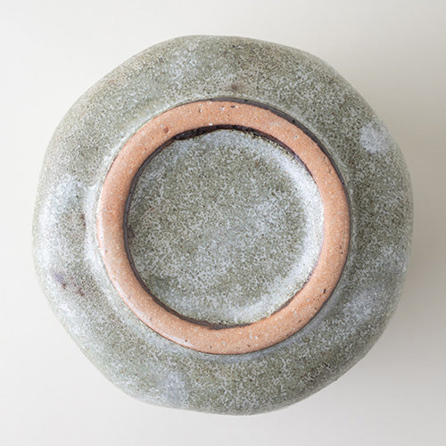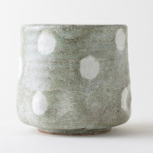 The Shiratama Yunomi Cup is more elaborate than meets the eye. It is glazed with a greenish glaze, and after drying, a polka dot pattern is hand-painted with a white glaze.