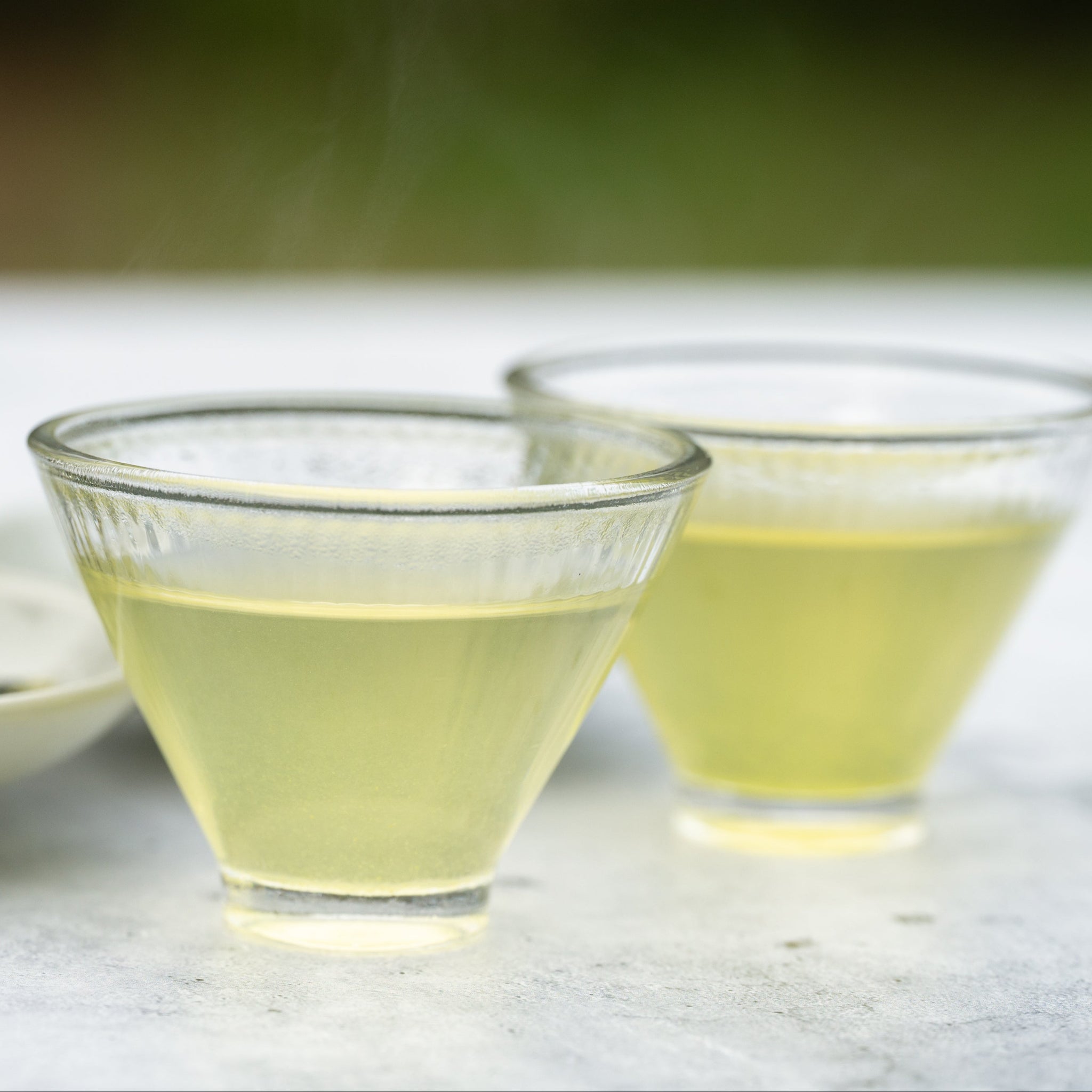 Kukicha (AKA "stem tea" or "twig tea") itself is known to contain less caffeine and more L-theanine than the leaves, as much of the L-theanine in the tea plant is found in the stems. L-theanine imparts an umami, slightly savory note to the tea. Because there is less caffeine and more L-theanine, kukicha is known to have a milder flavor than leaf tea. This is especially true of Karigane, as the shading it goes through preserves more L-theanine.